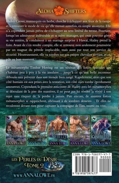 Hailey Crewe, mannequin en herbe, cherche à échapper aux feux de la rampe et à retrouver le mode de vie qu'elle menait autrefois, en simple anonyme. Elle n'a cependant jamais prévu de s'échapper au sens littéral du terme. Pourtant, lorsqu'un admirateur indésirable et sa mère-manager, qui croit pouvoir gérer sa vie entière, la conduisent à un mariage surprise à Hawaï, Hailey prend la fuite. Avant de s'en rendre compte, elle se retrouve non seulement poursuivie par un magnat du pétrole implacable, mais aussi par tout son service de sécurité. Heureusement, elle va tomber sur son propre chevalier servant, et ce, pile au bon moment. Le métamorphe Timber Hoving est un vétéran des forces spéciales qui s'habitue peu à peu à la vie insulaire... jusqu'à ce qu'une belle inconnue déboule sans prévenir dans son monde bien rangé. Rapidement, alors que son côté humain est aux prises avec la tentation, son côté ours tombe éperdument amoureux. Cependant, la première rencontre de Hailey avec les métamorphes se déroulant de la pire des manières, il ne peut pas lui révéler la vérité à son sujet sans risquer de la perdre à jamais. Pire encore, de sinistres forces métamorphes se rapprochent, obéissant à de sombres desseins... Et elles ne reculeront devant rien pour capturer la compagne de Tim, morte ou vive. Ours rebelle est une romance paranormale au rythme effréné et pleine d'émotions, où désirs, passions crépitantes et amour interdit s'entrechoquent. Prêt(s) à être bouleversé(s) par un monde de métamorphes plein de suspense sous le soleil de l'île de Maui¿? Achetez votre exemplaire de Ours rebelle maintenant¿! ALOHA SHIFTERS: LES PERLES DU DÉSIR est une nouvelle série palpitante se déroulant sur les rivages tropicaux de Maui. Chaque tome est bourré d'action, d'émotion et d'amour et vous tiendra en haleine ! Si vous aimez les métamorphes et les mâles alpha torrides, alors vous adorerez ces livres ! Tome 1 : Dragon rebelle Tome 2 : Ours rebelle Tome 3 : Lion rebelle Tome 4 : Loup rebelle Tome 5 : C¿ur rebelle Tome 6 : Alpha rebelle