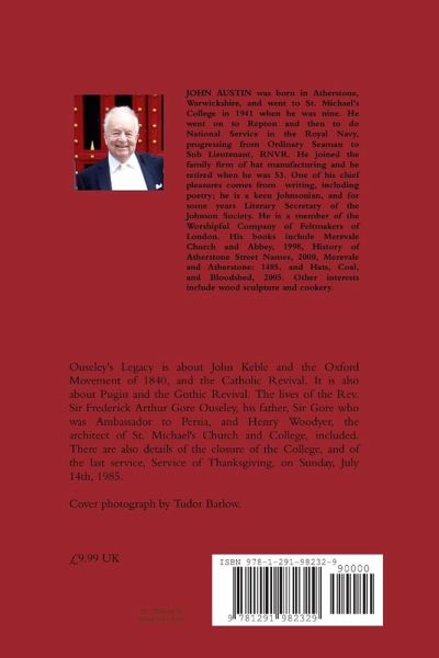 Ouseley's Legacy is about John Keble and the Oxford Movement of 1840, and the Catholic Revival. It is also about Pugin and the Gothic Revival. The lives of the Rev. Sir Frederick Arthur Gore Ouseley, his father, Sir Gore, who was Ambassador to Persia, and Henry Woodyer, the architect of St. Michael's Church and College, are included. There are also details of the closure of The College, and of the last service, Service of Thanksgiving, on Sunday, July 14th, 1985.