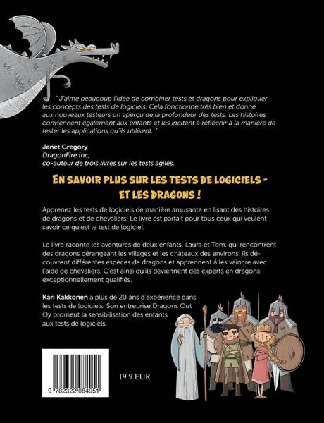 Apprenez les tests de logiciels de manière amusante en lisant des histoires de dragons et de chevaliers. Le livre convient à des enfants seuls ou accompagnés d'un adulte. Il convient aussi aux écoles et constitue un bon point de départ pour tous ceux qui veulent savoir ce qu'est le test de logiciel.Le livre raconte les aventures de deux enfants, Laura et Tom, qui rencontrent des dragons dérangeant les villages et les châteaux des environs. Ils découvrent différentes espèces de dragons et apprennent à les vaincre avec l'aide de chevaliers. C'est ainsi qu'ils deviennent des experts en dragons exceptionnellement qualifiés.Les histoires initient le lecteur aux termes et aux concepts des technologie de l'information et des test logiciels ; sous forme de paraboles, pour faciliter la compréhension et l'apprentissage. Ainsi, les dragons représentent les défauts dans le logiciel, les chevaliers sont les testeurs et les développeurs.Dans ce livre, Kari Kakkonen combine, d'une manière nouvelle et fascinante, sa passion pour la fantaisie et les tests de logiciels, créant ainsi une expérience agréable pour ses lecteurs.Le livre convient aux lecteurs de 10-99 ans, bien qu'il soit écrit avant tout pour les enfants.J'aime beaucoup l'idée de combiner tests et dragons pour expliquer les concepts des tests de logiciels. Cela fonctionne très bien et donne aux nouveaux testeurs un aperçu de la profondeur des tests. Les histoires conviennent également aux enfants et les incitent à réfléchir à la manière de tester les applications qu'ils utilisent. Janet Gregory, DragonFire Inc, co-auteur de trois livres sur les tests agiles.