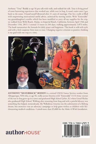 Anthony "Tony" Roddy at age 56 put talk with walk, and walked the talk. Tony is living proof of some harrowing experiences that worked out, while over in Iraq. It wasn't easier once I got back to the states. I found myself divorced after 21 years of marriage. Out for a walk is filled with empowering motivational useful advice, animated by moving stories. With "Esmeralda" my granddaughter's stroller which has been modified to carry all my supplies for the trip, we walked from Wells Beach, Maine, to Imperial Beach, California, between April 19th and December 15th, 2015. I crossed 13 states in 244 days, walking approximately 3,073 miles. The book summarizes the formula for daily peace and happiness. This book is told with style and with a little suspense from state to state. Changing negative criticism to positive thinking is my goal with one step at a time.