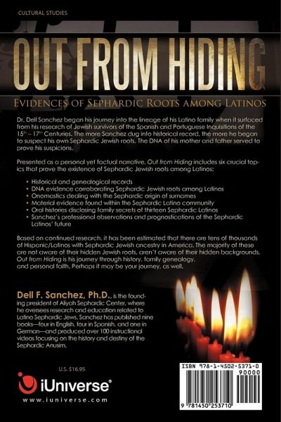 Dr. Dell Sanchez began his journey into the lineage of his Latino family when it surfaced from his research of Jewish survivors of the Spanish and Portuguese Inquisitions of the 15th - 17th Centuries. The more Sanchez dug into historical record, the more he began to suspect his own Sephardic Jewish roots. The DNA of his mother and father served to prove his suspicions. Presented as a personal yet factual narrative, Out from Hiding includes six crucial topics that prove the existence of Sephardic Jewish roots among Latinos: ¿ Historical and genealogical records ¿ DNA evidence corroborating Sephardic Jewish roots among Latinos ¿ Onomastics dealing with the Sephardic origin of surnames ¿ Material evidence found within the Sephardic Latino community ¿ Oral histories disclosing family secrets of thirteen Sephardic Latinos ¿ Sanchez's professional observations and prognostications of the Sephardic Latinos' future Based on continued research, it has been estimated that there are tens of thousands of Hispanic/Latinos with Sephardic Jewish ancestry in America. The majority of these are not aware of their hidden Jewish roots, aren't aware of their hidden backgrounds. Out from Hiding is his journey through history, family genealogy, and personal faith. Perhaps it may be your journey, as well.
