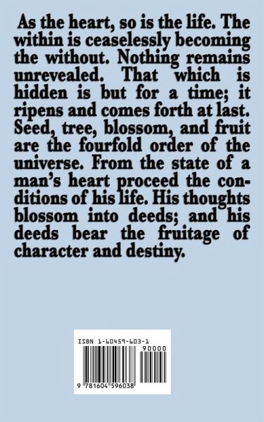As the heart, so is the life. The within is ceaselessly becoming the without. Nothing remains unrevealed. That which is hidden is but for a time; it ripens and comes forth at last. Seed, tree, blossom, and fruit are the fourfold order of the universe. From the state of a man's heart proceed the conditions of his life. His thoughts blossom into deeds; and his deeds bear the fruitage of character and destiny.