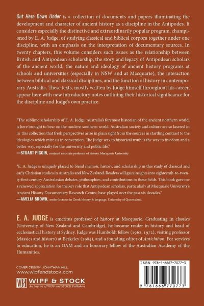 Out Here Down Under is a collection of documents and papers illuminating the development and character of ancient ¿history as a discipline in the Antipodes. It considers especially the distinctive and extraordinarily ¿popular program, championed by E. A. Judge, of studying classical and biblical corpora together under ¿one discipline, with an emphasis on the interpretation of documentary sources. ¿In twenty chapters, this volume considers such issues as the relationship between British and ¿Antipodean scholarship, the story and legacy of Antipodean scholars of the ancient world, the ¿nature and ideology of ancient history programs at schools and universities (especially in NSW ¿and at Macquarie), the interaction between biblical and classical disciplines, and the function of ¿history in contemporary Australia. These texts, mostly written by Judge himself throughout his career, appear here with new introductory notes outlining their historical significance for the discipline and Judge's own practice.