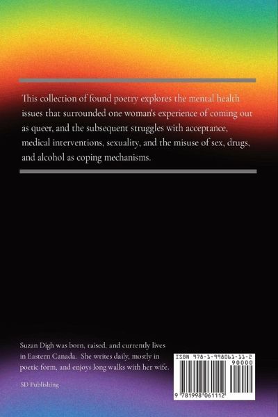 This alternative (and dark) collection of found poetry (primarily blackout) explores one LGBTQ+ woman's story as she navigated through struggles with mental health, gender identity/orientation, and societal acceptance. Through the deconstruction of an early draft version of the author's forthcoming novel, each poem touches on the emotions and challenges faced in the wake of coming out as queer. Through the dark, and sometimes unbearable, internal conflict and the pressure of the outside world wanting her to be different than she was... these words capture her very difficult struggle for belonging. The poet navigates the complexities of sexuality, medical interventions, and the allure of escapism through sex, drugs, and alcohol. Each word was selected for inclusion or blackout, page by page (word order not changed) in order to tell this story of survival in the face of homophobia. A testament to the power of expression and how transforming (and sharing) a text can be emotionally transformative, and help to shine a light into the darkness.
