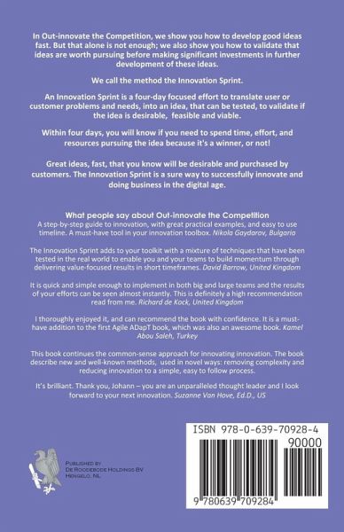 In Out-innovate the Competition, we show you how to develop good ideas fast. But that alone is not enough; we also show you how to validate that ideas are worth pursuing before making significant investments in further development of these ideas. We call the method The Innovation Sprint. An Innovation Sprint is a four-day focused effort to translate user or customer problems and needs, into an idea, that can be tested, to validate if the idea is desirable, feasible, and viable. Within four days, you will know if you need to spend time, effort, and resources pursuing the idea because it's a winner, or not!