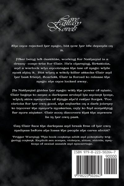 She once rejected her magic, but now her life depends on it. After being left destitute, working for Nathanial is a dream-come-true for Clair. He's charming, flirtatious, and a warlock who encourages the use of magic while most shun it. But when a witch-killer attacks Clair and her best friend, Scarlett, Clair is forced to release the magic she once locked away. As Nathanial guides her magic with the power of music, Clair begins to sense a darkness around his ancient home, which stirs memories of things she'd rather forget. Too curious for her own good, she embarks on a dark journey to uncover the manor's mysteries, only to find something far more sinister. Clair soon discovers that the answers lie in her own past. Can Clair face the darkness and break free of her own madness before she loses the people she cares about? Trigger Warning: This book contains adult and potentially triggering content. Explicit sex scenes, violence, abuse, suicide, mentions of sexual assault and miscarriage.
