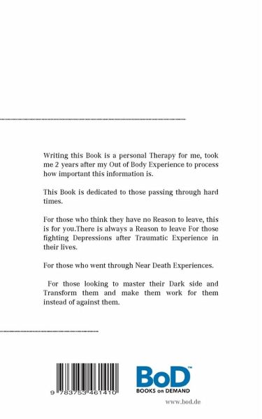 Writing this Book is a personal Therapy for me, took me 2 years after my Out of Body Experience to process how important this information is This Book is dedicated to those going through hard times in their Personal and Business lifes.For those who think they have no Reason to leave, this is for you.There is always a Reason.For those Looking for answer on How to trasnform their Pain For Those fighting Depression after Traumatic Experience, This Book is for you.This Book is a Guard line,For those going through mental pain and Physical pain.For those in critical position in their lifes, this book is for you.