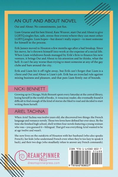 An Out and About Novel Out and About: No commitments, just fun. Liam Gruene and his best friend, Kate Weaver, start Out and About to give LGBTQ singles fun, safe, stress-free events where they can meet other LGBTQ singles. Liam hopes-but doesn't really expect-to meet someone for himself in the process. Erik Jansen moved to Houston a few months ago after a bad breakup. Since his move, he's thrown himself into work at the expense of a social life. When Liam withdraws funds managed by Erik's firm to finance his new venture, it brings Out and About to his attention and he thinks what the hell. It can't be any worse than trying to meet someone at any of the gay clubs and bars around the city. Erik and Liam hit it off right away, but Erik can't forget that Liam is a client and Out and About is Liam's job. Erik has an ironclad rule against mixing business and pleasure, and that puts Liam firmly out of bounds.