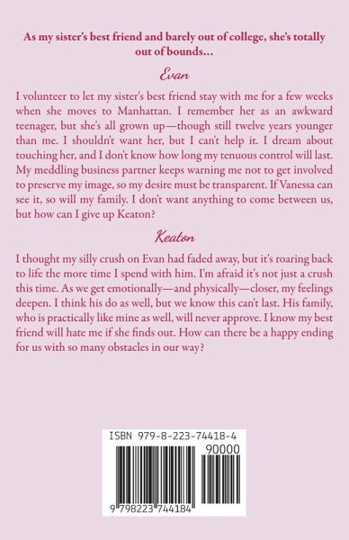 As my sister's best friend and barely out of college, she's totally out of bounds… Evan I volunteer to let my sister's best friend stay with me for a few weeks when she moves to Manhattan. I remember her as an awkward teenager, but she's all grown up-though still twelve years younger than me. I shouldn't want her, but I can't help it. I dream about touching her, and I don't know how long my tenuous control will last. My meddling business partner keeps warning me not to get involved to preserve my image, so my desire must be transparent. If Vanessa can see it, so will my family. I don't want anything to come between us, but how can I give up Keaton? Keaton I thought my silly crush on Evan had faded away, but it's roaring back to life the more time I spend with him. I'm afraid it's not just a crush this time. As we get emotionally-and physically-closer, my feelings deepen. I think his do as well, but we know this can't last. His family, who is practically like mine as well, will never approve. I know my best friend will hate me if she finds out. How can there be a happy ending for us with so many obstacles in our way?