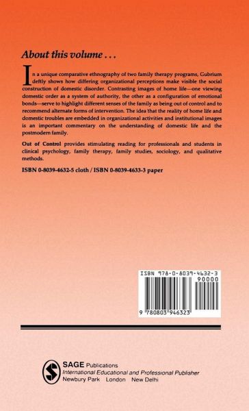 Counselling techniques that can help families regain control and causes of families breaking up are among the topics explored in this ethnographic account of therapeutic sessions. Two very different views of what a family is and how it becomes `out of control' emerge, resulting in vastly different therapeutic approaches. Gubrium compares two family counselling facilities - a community outpatient centre and a private family-focused psychiatric hospital - which have radically different concepts of the family. One setting examines a family's system including hidden structures, power relations, language and interaction as clues to the family's dysfunction. The other is concerned with affective relationships and deep emotions, h
