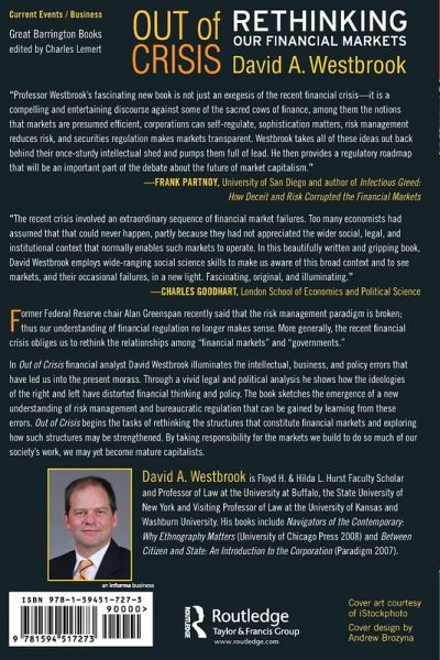 Former Federal Reserve chair Greenspan recently said that the risk management paradigm is broken; thus our understanding of financial regulation no longer makes sense. More generally, the current financial crisis obliges us to rethink the relationships among "financial markets" and "governments." In Out of Crisis financial analyst David Westbrook illuminates the intellectual, business, and policy errors that have led us into the present morass. Through a vivid legal and political analysis he shows how the ideologies of the right and left have distorted financial thinking and policy. Learning from these errors, the book sketches the emergence of a new understanding of risk management and bureaucratic regulation. Out of Crisis begins the tasks of rethinking the structures that constitute financial markets and exploring how such structures may be strengthened. Taking responsibility for the markets we build to do so much of our society's work, we may yet become mature capitalists.