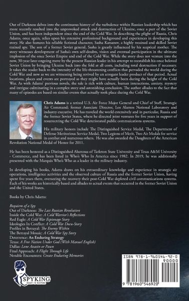 Out of Darkness delves into the continuous history of the turbulence within Russian leadership which has more recently resulted into the unprovoked attack and destruction of Ukraine, once a part of the Soviet Union, and has been independent since the end of the Cold War. In describing the plight of Russia, Chris Adams, once again, relies upon his extensive professional background and experiences in developing this story. He also features his reliable fictional character, Sasha Katsanov, a highly treained and skilled Soviet trained spy. The son of a former Soviet general, Sasha is greatly influenced by his sceptical mother. The story witnesses development of Sasha's own self-doubts, vision and eventual participation in the ultimate implosion of the once Soviet Empire and end of the Cold War. While the story does not venture into the now, 30-year later ongoing move by the present Russian leader in his attempt to reestablish his once beloved Soviet Union by bringing Ukraine back into the fold at all costs, including total destruction if necessary. It takes the reader back to the intensity of the life-threatening conflicts that pervaded the world during the Cold War and now as we are witnessing being revived by an arrogant leader product of that period. Actual locations, places and events are portrayed as they might have actually been during the height of the Cold War. As with Adams' previous novels, the tale is rich with culture, human interactions, anxiety, mystery and intrigue culminating in a complex story and astonishing conclusion. The author alludes to the fact that many of episodes are based on similar events that actually took place during the Cold War.