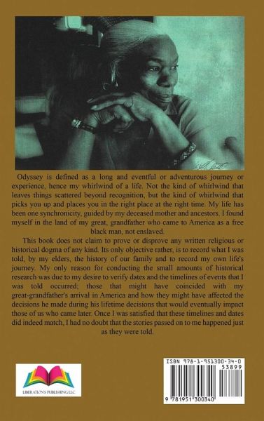 Odyssey is defined as a long and eventful or adventurous journey or experience, hence my whirlwind of a life. Not the kind of whirlwind that leaves things scattered beyond recognition, but the kind of whirlwind that picks you up and places you in the right place at the right time. My life has been one synchronicity, guided by my deceased mother and ancestors. I found myself in the land of my great, great, great grand father who came to America as a free black man, not enslaved. This book does not claim to prove or disprove any written religious or historical dogma of any kind. Its only objective rather, is to record what I was told, by my elders, the history of our family and to record my own life's journey. My only reason for conducting the small amounts of historical research was due to my desire to verify dates and the timelines of events that I was told occurred; those that might have coincided with my great-grandfather's arrival in America and how they might have affected the decisions he made during his lifetime--decisions that would eventually impact those of us who came later. Once I was satisfied that these timelines and dates did indeed match, I had no doubt that the stories passed on to me happened just as they were told.