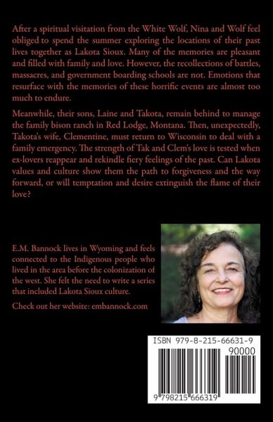 After a spiritual visitation from the White Wolf, Nina and Wolf are compelled to spend the summer exploring the locations of their past lives together as Lakota Sioux. Many of the memories are pleasant and filled with family and love. However, the recollections of battles, massacres, and government boarding schools are not. Emotions that resurface with the memories of these horrific events are almost too much to endure. Meanwhile, their sons, Laine and Takota, remain behind to manage the family bison ranch in Red Lodge, Montana. Then, unexpectedly, Takota's wife, Clementine, must return to Wisconsin to deal with a family emergency. The strength of Tak and Clem's love is tested when ex-lovers reappear and rekindle fiery feelings of the past. Can Lakota values and culture show them the path to forgiveness and the way forward, or will temptation and desire extinguish the flame of their love?