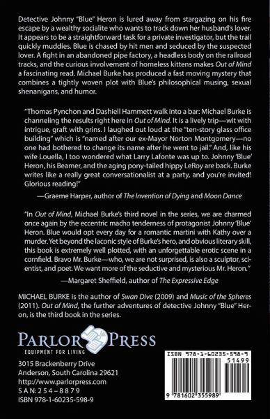 Detective Johnny "Blue" Heron is lured away from stargazing on his fire escape by a wealthy socialite who wants to track down her husband's lover. It appears to be a straightforward task for a private investigator, but the trail quickly muddies. Blue is chased by hit men and seduced by the suspected lover. A fight in an abandoned pipe factory, a headless body on the railroad tracks, and the curious involvement of homeless kittens makes OUT OF MIND a fascinating read. Michael Burke has produced a fast moving mystery that combines a tightly woven plot with Blue's philosophical musing, sexual shenanigans, and humor. "Thomas Pynchon and Dashiell Hammett walk into a bar: Michael Burke is channeling the results right here in OUT OF MIND. It is a lively trip-wit with intrigue, graft with grins. I laughed out loud at the "ten-story glass office building" which is "named after our ex-Mayor Norton Montgomery-no one had bothered to change its name after he went to jail." And, like his wife Louella, I too wondered what Larry Lafonte was up to. Johnny 'Blue' Heron, his Beamer, and the aging pony-tailed hippy LeRoy are back. Burke writes like a really great conversationalist at a party, and you're invited! Glorious reading!" -Graeme Harper, author of THE INVENTION OF DYING and MOON DANCE "In OUT OF MIND, Michael Burke's third novel in the series, we are charmed once again by the eccentric macho tenderness of protagonist Johnny 'Blue' Heron. Blue would opt every day for a romantic martini with Kathy over a murder. Yet beyond the laconic style of Burke's hero, and obvious literary skill, this book is extremely well plotted, with an unforgettable erotic scene in a cornfield. Bravo Mr. Burke-who, we are not surprised, is also a sculptor, scientist, and poet. We want more of the seductive and mysterious Mr. Heron." -Margaret Sheffield, author of THE EXPRESSIVE EDGE MICHAEL BURKE is the author of SWAN DIVE (2009) and MUSIC OF THE SPHERES (2011). OUT OF MIND, the further adventures of detective Johnny "Blue" Heron, is the third book in the series.