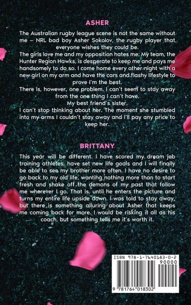Out of your league is a NRL Australian sports romance following Brittany Rhodes as she stumbles into a bar only to be swept off her feet by Asher Sokolov, Hunter region Hawks NRL bad boy. After a night they will not soon forget Brittany shows up at her new job to be introduced to her none other than her brothers best friend Asher. Can they keep their romance a secret from the whole team and her brother? ASHER The Australian rugby league scene is not the same without me - NRL bad boy Asher Sokolov, the rugby player that everyone wishes they could be. The girls love me and my opposition hates me. My team, the Hunter Region Hawks, is desperate to keep me and pays me handsomely to do so. I come home every other night with a new girl on my arm and have the cars and flashy lifestyle to prove I'm the best. There is, however, one problem. I can't seem to stay away from the one thing I can't have. My best friend's sister. I can't stop thinking about her. The moment she stumbled into my arms I couldn't stay away and I'll pay any price to keep her. BRITTANY This year will be different. I have scored my dream job training athletes, have set new life goals and I will finally be able to see my brother more often. I have no desire to go back to my old life, wanting nothing more than to start fresh and shake off the demons of my past that follow me wherever I go. That is, until he enters the picture and turns my entire life upside down. I was told to stay away, but there is something alluring about Asher that keeps me coming back for more. I would be risking it all as his coach, but something tells me it's worth it.