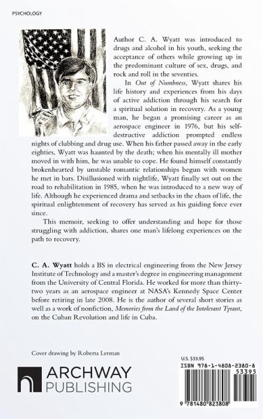 Author C. A. Wyatt was introduced to drugs and alcohol in his youth, seeking the acceptance of others while growing up in the predominant culture of sex, drugs, and rock and roll in the seventies. In Out of Numbness, Wyatt shares his life history and experiences from his days of active addiction through his search for a spiritual solution in recovery. As a young man, he began a promising career as an aerospace engineer in 1976, but his self-destructive addiction prompted endless nights of clubbing and drug use. When his father passed away in the early eighties, Wyatt was haunted by the death; when his mentally ill mother moved in with him, he was unable to cope. He found himself constantly brokenhearted by unstable romantic relationships begun with women he met in bars. Disillusioned with nightlife, Wyatt finally set out on the road to rehabilitation in 1985, when he was introduced to a new way of life. Although he experienced drama and setbacks in the chaos of life, the spiritual enlightenment of recovery has served as his guiding force ever since. This memoir, seeking to offer understanding and hope for those struggling with addiction, shares one man's lifelong experiences on the path to recovery.