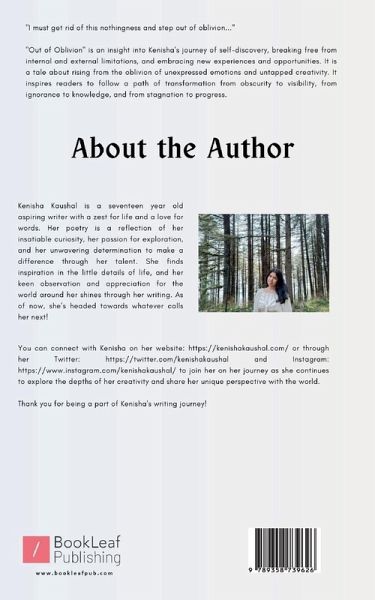 ""I must get rid of this nothingness and step out of oblivion..."" ""Out of Oblivion"" is an insight into Kenisha's journey of self-discovery, breaking free from internal and external limitations, and embracing new experiences and opportunities. It is a tale about rising from the oblivion of unexpressed emotions and untapped creativity. It inspires readers to follow a path of transformation from obscurity to visibility, from ignorance to knowledge, and from stagnation to progress.