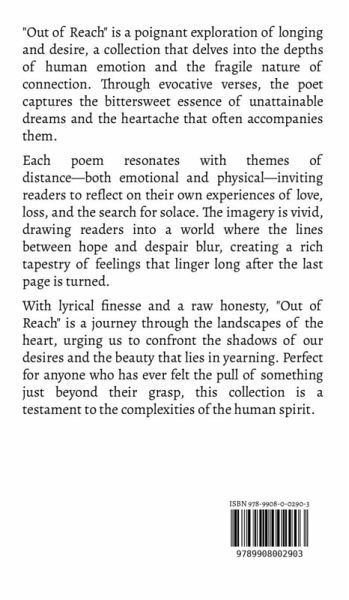 "Out of Reach" is a poignant exploration of longing and desire, a collection that delves into the depths of human emotion and the fragile nature of connection. Through evocative verses, the poet captures the bittersweet essence of unattainable dreams and the heartache that often accompanies them. Each poem resonates with themes of distance-both emotional and physical-inviting readers to reflect on their own experiences of love, loss, and the search for solace. The imagery is vivid, drawing readers into a world where the lines between hope and despair blur, creating a rich tapestry of feelings that linger long after the last page is turned. With lyrical finesse and a raw honesty, "Out of Reach" is a journey through the landscapes of the heart, urging us to confront the shadows of our desires and the beauty that lies in yearning. Perfect for anyone who has ever felt the pull of something just beyond their grasp, this collection is a testament to the complexities of the human spirit.