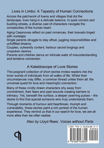 Lives in Limbo: A Tapestry of Human Connections Across the patchwork of towns and villages that dot the landscape, lives hang in a delicate balance. In quiet corners and bustling streets, a diverse cast of characters navigate the complexities of the human heart:Aging Casanovas reflect on past romances, their bravado tinged with nostalgia Single parents struggle to stay afloat, juggling responsibilities and unfulfilled dreams Couples, outwardly content, harbour secret longings and unspoken desires Parents and children dance an intricate waltz of misunderstanding and tentative connection A Kaleidoscope of Love Stories This poignant collection of short stories invites readers into the inner worlds of individuals from all walks of life. While their circumstances may differ, a common thread unites them all: the universal quest for love and meaningful connection. Many of these vividly drawn characters shy away from commitment, their fears and past wounds creating barriers to intimacy. Yet, beneath the surface, a deeper yearning pulses - the desire to find that special someone who truly understands them. Through moments of humour and heartbreak, triumph and vulnerability, these stories paint a rich portrait of the human experience. They remind us that in our search for love, we are all more alike than we often realize.