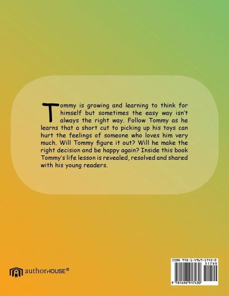 Tommy is growing and learning to think for himself but sometimes the easy way isn't always the right way. Follow Tommy as he learns that a short cut to picking up his toys can hurt the feelings of someone who loves him very much. Will Tommy figure it out? Will he make the right decision and be happy again? Inside this book Tommy's life lesson is revealed, resolved and shared with his young readers.