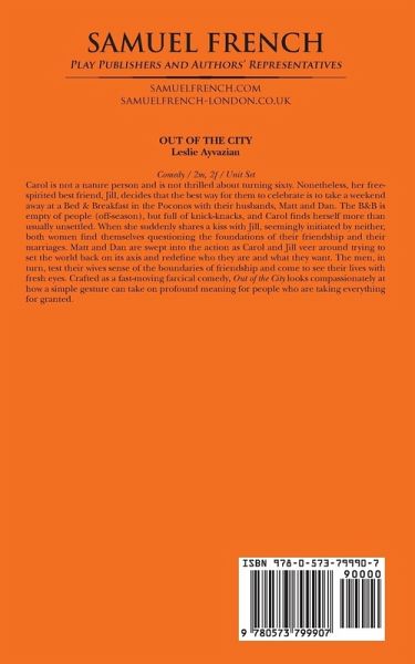 Carol is not a nature person and is not thrilled about turning 60. Nonetheless, her free-spirited best friend Jill decides that the best way for them to celebrate is to take a weekend away at a bed and breakfast in the Poconos with their husbands, Matt and Dan. The B&B is empty of people (off season), but full of knick-knacks, and Carol finds herself more than usually unsettled. When she suddenly shares a kiss with Jill, seemingly initiated by neither, both women find themselves questioning the foundations of their friendship and their marriages. Matt and Dan are swept into the action as Carol and Jill veer around trying to set the world back on its axis and redefine who they are and what they want. The men, in turn, test their wives sense of the boundaries of friendship and come to see their lives with fresh eyes. Crafted as a fast-moving farcical comedy, Out of the City looks compassionately at how a simple gesture can take on profound meaning for people who are taking everything for granted.