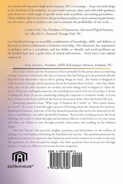 Out of the Cubicle and Into Business is written primarily for the person that is considering owning a business. Individuals who have a business that isn't living up to its potential will also find this book informative and an aid to getting things on track. The format is designed to walk the reader through critical questions about the business they envision - what they think, want, and can do; what resources are needed; and what things need to happen to "open the doors". If you are working for someone else and think you can do it better, if you have a dream of calling the shots, if you are considering exiting the corporate or academic world, or if you have a business that hasn't achieved the level of success you desire, then this book is for you. Answering questions from "What type of business do I want?" to "How much money do I need?" the reader is lead through a process of learning about the elements of a business, planning the business, and some of the key financial questions that need to be answered on the way to establishing a successful (profitable) business. Beyond the learning process, the book challenges the reader to think through and document what he or she believes to be true versus what they can validate as true through research, observation, and working on the business design. This isn't "theory", but practical insights, questions, and information on the realities of starting your own business and laying the foundation for success. The questions presented are fundamental and proven questions that businesses need to have answers to in order to succeed. The questions are often deceptively simple, but these questions have been proven through practice to make the difference in success for new companies.