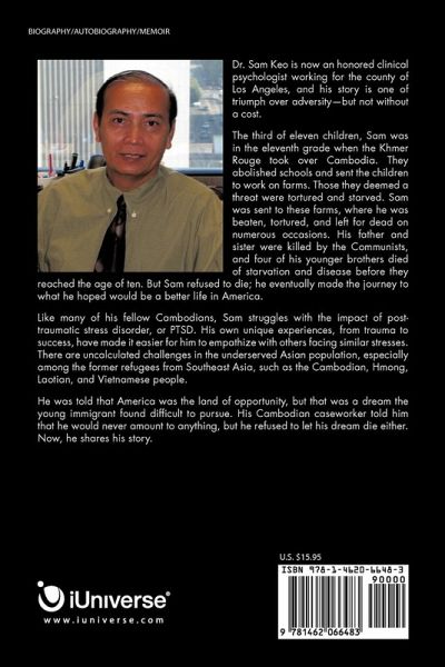 Dr. Sam Keo is now an honored clinical psychologist working for the county of Los Angeles, and his story is one of triumph over adversity-but not without a cost. The third of eleven children, Sam was in the eleventh grade when the Khmer Rouge took over Cambodia. They abolished schools and sent the children to work on farms. Those they deemed a threat were tortured and starved. Sam was sent to these farms, where he was beaten, tortured, and left for dead on numerous occasions. His father and sister were killed by the Communists, and four of his younger brothers died of starvation and disease before they reached the age of ten. But Sam refused to die; he eventually made the journey to what he hoped would be a better life in America. Like many of his fellow Cambodians, Sam struggles with the impact of posttraumatic stress disorder, or PTSD. His own unique experiences, from trauma to success, have made it easier for him to empathize with others facing similar stresses. There are uncalculated challenges in the underserved Asian population, especially among the former refugees from Southeast Asia, such as the Cambodian, Hmong, Laotian, and Vietnamese people. He was told that America was the land of opportunity, but that was a dream the young immigrant found difficult to pursue. His Cambodian caseworker told him that he would never amount to anything, but he refused to let his dream die either. Now, he shares his story.