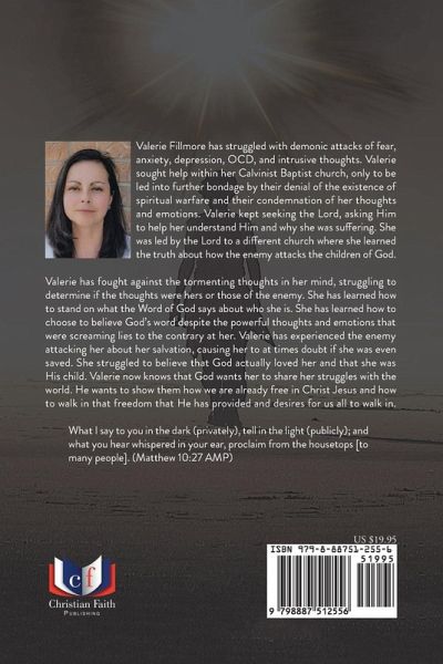 Valerie Fillmore has struggled with demonic attacks of fear, anxiety, depression, OCD, and intrusive thoughts. Valerie sought help within her Calvinist Baptist church, only to be led into further bondage by their denial of the existence of spiritual warfare and their condemnation of her thoughts and emotions. Valerie kept seeking the Lord, asking Him to help her understand Him and why she was suffering. She was led by the Lord to a different church where she learned the truth about how the enemy attacks the children of God. Valerie has fought against the tormenting thoughts in her mind, struggling to determine if the thoughts were hers or those of the enemy. She has learned how to stand on what the Word of God says about who she is. She has learned how to choose to believe God's word despite the powerful thoughts and emotions that were screaming lies to the contrary at her. Valerie has experienced the enemy attacking her about her salvation, causing her to at times doubt if she was even saved. She struggled to believe that God actually loved her and that she was His child. Valerie now knows that God wants her to share her struggles with the world. He wants to show them how we are already free in Christ Jesus and how to walk in that freedom that He has provided and desires for us all to walk in. What I say to you in the dark (privately), tell in the light (publicly); and what you hear whispered in your ear, proclaim from the housetops [to many people]. (Matthew 10:27 AMP)
