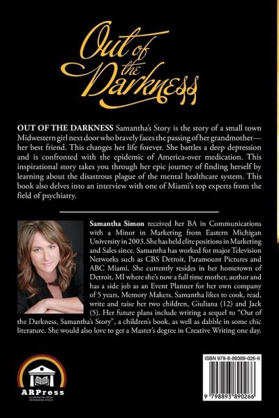 OUT OF THE DARKNESS Samantha's Story is the story of a small town Midwestern girl next door who bravely faces the passing of her grandmother-her best friend. This changes her life forever. She battles a deep depression and is confronted with the epidemic of America-over medication. This inspirational story takes you through her epic journey of finding herself by learning about the disastrous plague of the mental healthcare system. This book also delves into an interview with one of Miami's top experts from the field of psychiatry.