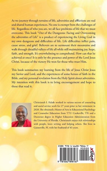 As we journey through terrains of life, adversities and afflictions are real and shared human experiences. No one is exempt from the challenges of life. Regardless of who you are, we all face problems of life that we must overcome. This book "Out of the Dungeons: Facing and Overcoming the adversities of Life" is a product of experiencing the Living God in my own dungeons and difficulties of life. Life difficulties inflict pain, cause stress, and grief. Believers are to surmount their mountains and walk through dreadful valleys of life all while still maintaining joy, hope, faith, and strength. It's overwhelming to comprehend. How can that be achieved at once? It is only by the presence and power of the Lord Jesus Christ, because of the victory He won for those who trust Him. This book summarizes my learning from the life of Jesus Christ Jesus my Savior and Lord, and the experiences of some heroes of faith in the Bible, and my personal revelation from the Holy Spirit about adversities. My intention with this book is to bring encouragement and hope to those that read it. Christianah I. Falade worked in various sectors of counseling and social service work for 27 years prior to her retirement in 2020. She obtained a Master of Arts in Educational Psychology and Counselor Education from TTU Cookeville, TN and a Doctorate degree in Higher Education Administration from the University of Florida. Christianah enjoys rich relationships with people, loves writing and helping others. She lives in Gainesville, FL with her husband of 43 years.