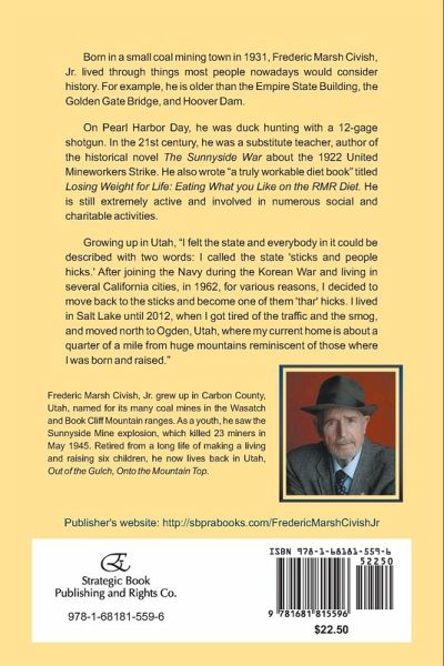 Born in a small coal mining town in 1931, Frederic Marsh Civish, Jr. lived through things most people nowadays would consider history. For example, he is older than the Empire State Building, the Golden Gate Bridge, and Hoover Dam.On Pearl Harbor Day, he was duck hunting with a 12-gage shotgun. In the 21st century, he was a substitute teacher, author of the historical novel The Sunnyside War about the 1922 United Mineworkers Strike. He also wrote "a truly workable diet book" titled Losing Weight for Life: Eating What you Like on the RMR Diet. He is still extremely active and involved in numerous social and charitable activities.Growing up in Utah, "I felt the state and everybody in it could be described with two words: I called the state 'sticks' and people 'hicks.' After joining the Navy during the Korean War and living in several California cities, in 1962, for various reasons, I decided to move back to the sticks and become one of them 'thar' hicks. I lived in Salt Lake until 2012, when I got tired of the traffic and the smog, and moved north to Ogden, Utah, where my current home is about a quarter of a mile from huge mountains reminiscent of those where I was born and raised."Frederic Marsh Civish, Jr. grew up in Carbon County, Utah, named for its many coal mines in the Wasatch and Book Cliff Mountain ranges. As a youth, he saw the Sunnyside Mine explosion, which killed 23 miners in May 1945. Retired from a long life of making a living and raising six children, he now lives back in Utah, Out of the Gulch, Onto the Mountain Top.Publisher's website: http://sbprabooks.com/FredericMarshCivishJr
