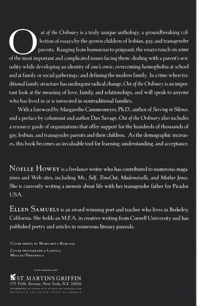Out of the Ordinary is a truly unique anthology, a groundbreaking collection of essays by the grown children of lesbian, gay, and transgender parents. Ranging from humorous to poignant, the essays touch on some of the most important and complicated issues facing them: dealing with a parent's sexuality while developing an identity of one's own; overcoming homophobia at school and at family or social gatherings; and defining the modern family. In a time when traditional family structure has undergone radical change, Out of the Ordinary is an important look at the meaning of love, family, and relationships, and will speak to anyone who has lived or is interested in non-traditional families. With a foreword by Margarethe Cammermeyer, Ph.D., author of Serving in Silence, and a preface by columnist and author Dan Savage, Out of the Ordinary also includes a resource guide of organizations that offer support for the hundreds of thousands of gay, lesbian, and transgender parents and their children. As the demographic increases, this book becomes an invaluable tool for learning, understanding, and acceptance.