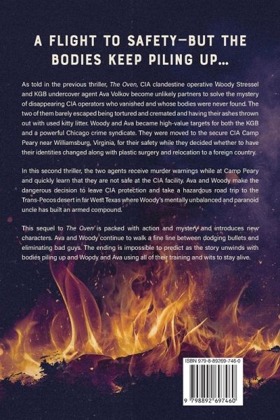 A FLIGHT TO SAFETY-BUT THE BODIES KEEP PILING UP... As told in the previous thriller, The Oven, CIA clandestine operative Woody Stressel and KGB undercover agent Ava Volkov become unlikely partners to solve the mystery of disappearing CIA operators who vanished and whose bodies were never found. The two of them barely escaped being tortured and cremated and having their ashes thrown out with used kitty litter. Woody and Ava became high-value targets for both the KGB and a powerful Chicago crime syndicate. They were moved to the secure CIA Camp Peary near Williamsburg, Virginia, for their safety while they decided whether to have their identities changed along with plastic surgery and relocation to a foreign country. In this second thriller, the two agents receive murder warnings while at Camp Peary and quickly learn that they are not safe at the CIA facility. Ava and Woody make the dangerous decision to leave CIA protection and take a hazardous road trip to the Trans-Pecos desert in far West Texas where Woody's mentally unbalanced and paranoid uncle has built an armed compound. This sequel to The Oven is packed with action and mystery and introduces new characters. Ava and Woody continue to walk a fine line between dodging bullets and eliminating bad guys. The ending is impossible to predict as the story unwinds with bodies piling up and Woody and Ava using all of their training and wits to stay alive.