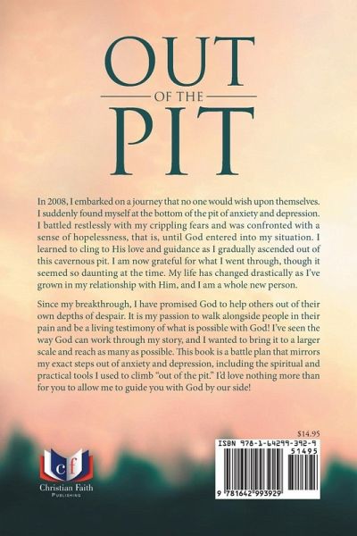 In 2008, I embarked on a journey that no one would wish upon themselves. I suddenly found myself at the bottom of the pit of anxiety and depression. I battled restlessly with my crippling fears and was confronted with a sense of hopelessness, that is, until God entered into my situation. I learned to cling to His love and guidance as I gradually ascended out of this cavernous pit. I am now grateful for what I went through, though it seemed so daunting at the time. My life has changed drastically as I've grown in my relationship with Him, and I am a whole new person. Since my breakthrough, I have promised God to help others out of their own depths of despair. It is my passion to walk alongside people in their pain and be a living testimony of what is possible with God! I've seen the way God can work through my story, and I wanted to bring it to a larger scale and reach as many as possible. This book is a battle plan that mirrors my exact steps out of anxiety and depression, including the spiritual and practical tools I used to climb "out of the pit." I'd love nothing more than for you to allow me to guide you with God by our side!