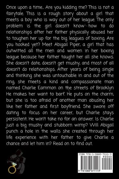 Once upon a time... Are you kidding me? This is not a fairytale. This is a rough story about a girl that meets a boy who is way out of her league. The only problem is the girl doesn't know how to do relationships after her father physically abused her to toughen her up for the big leagues of boxing. Are you hooked yet? Meet Abigail Piper, a girl that has outwitted all the men and women in her boxing league because her father taught her all she knows. She doesn't date, doesn't get mushy, and most of all doesn't do relationships. After years of being single and thinking she was untouchable in and out of the ring, she meets a kind and compassionate man named Charlie Eammon on the streets of Brooklyn He makes her want to barf. He puts on the charm, but she is too afraid of another man abusing her like her father and first boyfriend. She swore off dating to focus on her career, but Charlie stays persistent. He won't take no for an answer. Is Charlie just a big mushy and stubborn wimp? Will Abigail punch a hole in the walls she created through her life experience with her father to give Charlie a chance and let him in? Read on to find out.