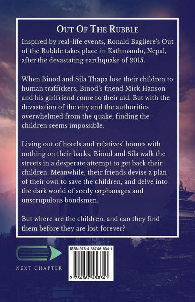 Inspired by real-life events, Ronald Bagliere's Out of the Rubble takes place in Kathmandu, Nepal, after the devastating earthquake of 2015. When Binod and Sila Thapa lose their children to human traffickers, Binod's friend Mick Hanson and his girlfriend come to their aid. But with the devastation of the city and the authorities overwhelmed from the quake, finding the children seems impossible. Living out of hotels and relatives' homes with nothing on their backs, Binod and Sila walk the streets in a desperate attempt to get back their children. Meanwhile, their friends devise a plan of their own to save the children, and delve into the dark world of seedy orphanages and unscrupulous bondsmen. But where are the children, and can they find them before they are lost forever?