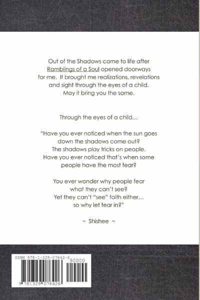 Let Out of the Shadows bring you to a gentler place in life. It is the continuation of its sister book Ramblings of a Soul. Ramblings stirred emotions deep within. Out of the Shadows calms those emotions and brings a sense of peace, understanding and openness to life. Come further on the journey with me. Accept the gifts that this book brings.