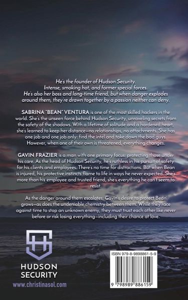 He's the founder of Hudson Security. Intense, smoking hot, and former special forces. He's also her boss and long-time friend, but when danger explodes around them, they're drawn together by a passion neither can deny. Sabrina "Bean" Ventura is one of the most skilled hackers in the world. She's the unseen force behind Hudson Security, unraveling secrets from the safety of the shadows. With a lifetime of solitude and a hardened heart, she's learned to keep her distance-no relationships, no attachments. She has one job and one job only: find the intel and take down the bad guys. However, when one of their own is threatened, everything changes. Gavin Frazier is a man with one primary focus: protecting those under his care. As the head of Hudson Security, he's ruthless in his pursuit of safety for his clients and employees. There's no time for distractions. But when Bean is injured, his protective instincts flame to life in ways he never expected. She's more than his employee and trusted friend, she's everything he can't seem to resist. As the danger around them escalates, Gavin's desire to protect Bean grows-as does the undeniable chemistry between them. While they race against time to stop an unknown enemy, they must trust each other like never before or risk losing everything-including their chance at love. Author's Note: Please check the author's website for all CWs and tropes.