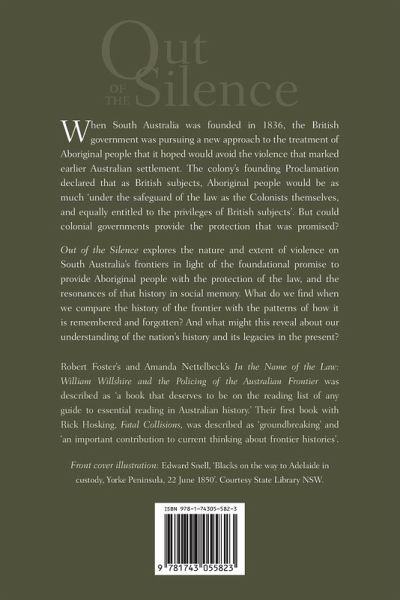 When South Australia was founded in 1836, the British government was pursuing a new approach to the treatment of Aboriginal people, hoping to avoid the violence that marked earlier Australian settlement. The colony's founding Proclamation declared that as British subjects, Aboriginal people would be as much 'under the safeguard of the law as the Colonists themselves, and equally entitled to the privileges of British subjects'. But could colonial governments provide the protection that was promised? Out of the Silence explores the nature and extent of violence on South Australia's frontiers in light of the foundational promise to provide Aboriginal people with the protection of the law, and the resonances of that history in social memory. What do we find when we compare the history of the frontier with the patterns of how it is remembered and forgotten? And what might this reveal about our understanding of the nation's history and its legacies in the present?