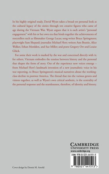 This study, first published in 1994, looks at the cultural legacy of the sixties through ten creative figures who came of age during the Vietnam War. Wyatt argues that it is each artist's 'personal engagement' with his own era that binds together the achievements of storytellers such as filmmaker George Lucas, songwriter Bruce Springsteen, playwright Sam Shepard, journalist Michael Herr, writers Ann Beattie, Alice Walker, Ethan Mordden, Sue Miller, and poets Gregory Orr and Louise Gluck. For some their work is marked by the war and concerned directly with it; in others, Vietnam represents the prevailing counterculture sensibility often associated with the sixties. Out of the experience new voices emerge - from Michael Herr's landmark invention of a new journalistic voice in his Vietnam War reporting to Bruce Springsteen's tapping of the working class decline in postwar America.