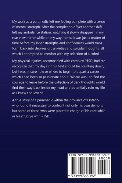My work as a paramedic left me feeling complete with a sense of mental strength. After the completion of yet another shift, I left my ambulance station, watching it slowly disappear in my rear view mirror while on my way home. It was just a matter of time before my inner strengths and confidences would transform back into depression, anxieties and suicidal thoughts, all which I attempted to comfort with my selection of alcohol. My physical injuries, accompanied with complex PTSD, had me recognize that my days in this field should be counting down, but I wasn't sure how or where to begin to depart a career which I had been so passionate about. Where was I to find the courage to leave before the collection of dark thoughts would find their way back inside my head and potentially ruin my life as I knew and loved? A true story of a paramedic within the province of Ontario who found it necessary to confront not only his own demons but some of those who were placed in charge of his care while in his struggle with PTSD. Now updated to include an epilogue on how the author is doing now.