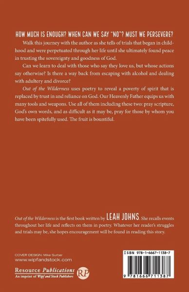 How much is enough? When can we say ""No""? Must we persevere? Walk this journey with the author as she tells of trials that began in childhood and were perpetuated through her life until she ultimately found peace in trusting the sovereignty and goodness of God. Can we learn to deal with those who say they love us, but whose actions say otherwise? Is there a way back from escaping with alcohol and dealing with adultery and divorce? Out of the Wilderness uses poetry to reveal a poverty of spirit that is replaced by trust in and reliance on God. Our Heavenly Father equips us with many tools and weapons. Use all of them including these two: pray scripture, God's own words, and as difficult as it may be, pray for those by whom you have been spitefully used. The fruit is bountiful.