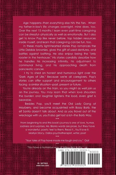 Age happens--then everything else hits the fan. When my father-in-law's life changes overnight, mine does, too. These mostly light-hearted stories offer encouragement to others in a similar situation--past, present or future. See Pop romance the Little Debbie brownies, battle against bathing, and enjoy being the "only rooster in the henhouse." Meet the Old Lady Gang at Mayberry, and Bossy Barb, the elf Santa doesn't talk about. Pop's stories also candidly describe how he adjusts to communal living, handles his increasing infirmity and his approaching death from pancreatic cancer. We're all riding the same train, so join us on our simple adventures as we haul ourselves out of the wreckage. (Also available at amazon.com, on Kindle, and at www.barbara-blanks.com)