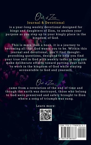 Out of Zion - Journal & Devotional is a year-long weekly devotional designed for kings and daughters of Zion, to awaken your purpose as you step up to your kingly place in the kingdom of God. This is more than a book, it is a journey to becoming all that God wants you to be. Within this journal and devotional, you'll find thought-provoking questions that are designed to help you find your true self in God with weekly tasks to help you make conscious efforts toward putting your faith to work in the kingdom of God while staying accountable to God and yourself. Out of Zion - Journal & Devotional is an excellent companion for bible study time and serves as a great resource tool for digging deep into God's word and journaling as you get exposed to new knowledge in His word. This Journal & Devotional have been designed to be a life-long companion with durable hardcover and a journal that allows you to write your thoughts, revisit them to track your progress, and assess your goals and accomplishment. There is also a "Find your Purpose Trivia Quiz" within the book which has been carefully and thoughtfully designed to take you on a self-discovery journey, so you can find more meaning in life and discover your God-given purpose. Out of Zion - Journal & Devotional exposes you to more of God and throughout the journey and process of becoming, you would: ¿ Learn to know and hear God speak. ¿ Discover why God made you and what your purpose on earth is. ¿ Awaken your purpose and passion. ¿ Find your voice and place of dominion and authority. ¿ Overcome the obstacles preventing you from becoming all that God has made you to be. ¿ Take your place in God's Kingdom and begin to function in your royal authority as a daughter of Zion. ¿ Spread the gospel of God's Kingdom to the ends of the earth, so that God's glory will reign forever.