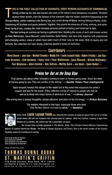 Out on the Deep Blue is the first collection of dramatic, first-person accounts of commercial fishing written by the men and women who work in the nation's most dangerous occupation. Nineteen diverse fisher-writers, from the famous to the unknown, take the reader swordfish harpooning on the Georges Banks, winter crabbing in the Bering Sea, sea-urchin diving off Maine, herring fishing in Alaska, shark-harpooning off Scotland and points between. Together, they plumb the extremes of living, working, and sometimes dying at sea, creating the most intensely personal portrait of fishing and fishermen to date. The best writing on commercial fishing is gathered here, blending the voices of such well-known writers as Peter Mathiessen, Gavin Maxwell, Linda Greenlaw, Spike Walker, and John Cole, together with experienced and emerging writers, many of whom have spent much of their lives on the water. With its layers and rich textures, this collection will have strong, enduring appeal to loves of nonfiction. Contributors: Marie Beaver John Cole Michael Crowley Wendy Erd Leslie Leyland Fields Robert Fritchey Joel Gay Linda Greenlaw Seth Harkness Nancy Lord Peter Matthiessen Gavin Maxwell William McCloskey Paul Molyneaux Debra Nielsen Toby Sullivan Martha Sutro Joe Upton Spike Walker