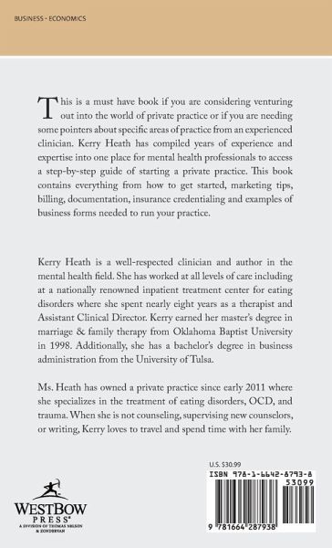 This is a must have book if you are considering venturing out into the world of private practice or if you are needing some pointers about specific areas of practice from an experienced clinician. Kerry Heath has compiled years of experience and expertise into one place for mental health professionals to access a step-by-step guide of starting a private practice. This book contains everything from how to get started, marketing tips, billing, documentation, insurance credentialing and examples of business forms needed to run your practice.