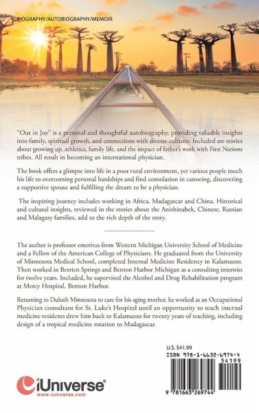 "Out in Joy" is a personal and thoughtful autobiography, providing valuable insights into family, spiritual growth, and connections with diverse cultures. Included are stories about growing up, athletics, family life, and the impact of father's work with First Nations tribes. All result in becoming an international physician. The book offers a glimpse into life in a poor rural environment, yet various people touch his life to overcoming personal hardships and find consolation in canoeing, discovering a supportive spouse and fulfilling the dream to be a physician. The inspiring journey includes working in Africa, Madagascar and China. Historical and cultural insights, reviewed in the stories about the Anishinabek, Chinese, Russian and Malagasy families, add to the rich depth of the story.