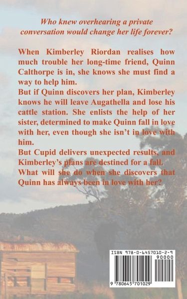 Who knew overhearing a private conversation would change her life forever? When Kimberley Riordan realises how much trouble her long-time friend, Quinn Calthorpe is in, she knows she must find a way to help him. But if Quinn discovers her plan, Kimberley knows he will leave Augathella and lose his cattle station. She enlists the help of her sister, determined to make Quinn fall in love with her, even though she isn't in love with him. But Cupid delivers unexpected results, and Kimberley's plans are destined for a fall. What will she do when she discovers that Quinn has always been in love with her?