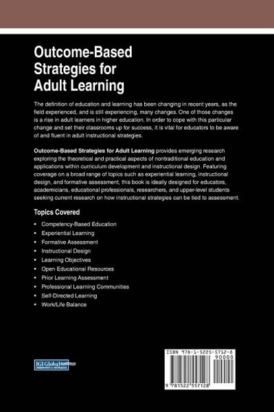 The definition of education and learning has been changing in recent years, as the field experienced, and is still experiencing, many changes. One of those changes is a rise in adult learners in higher education. In order to cope with this particular change and set their classrooms up for success, it is vital for educators to be aware of and fluent in adult instructional strategies. Outcome-Based Strategies for Adult Learning provides emerging research exploring the theoretical and practical aspects of nontraditional education and applications within curriculum development and instructional design. Featuring coverage on a broad range of topics such as experiential learning, instructional design, and formative assessment, this book is ideally designed for educators, academicians, educational professionals, researchers, and upper-level students seeking current research on how instructional strategies can be tied to assessment.